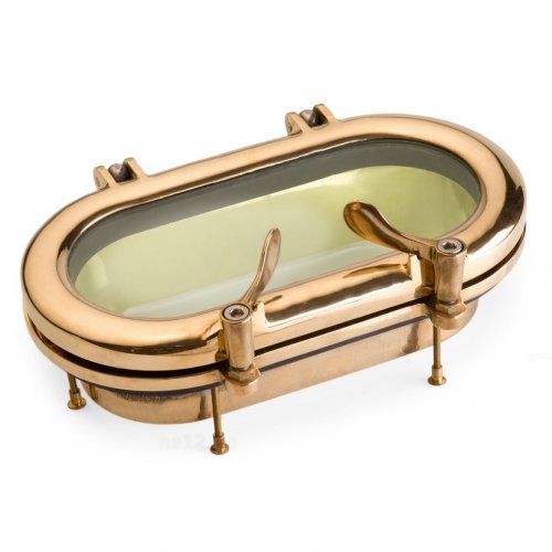 Oval portholes made from polished brass to build into doors and walls. These portholes are perfect maritime accessories for rooms and can be used in restaurants as well as in private buildings. The window can be opened and closed by small brass bars. The installation frame of the oval portholes is delivered with matching brass screws. It is available in two different editions. The portholes are manufactured in Europe. Please find the installation measurements in the accompanying table.